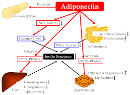 Adiponectin, in turn, supercharges the breakdown of fatty acids and regulates blood sugar (glucose) levels: