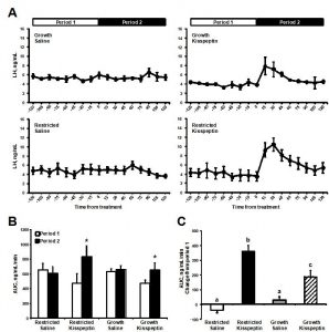 “In fed animals, both prepubertal female and male rats demonstrated a 9 to 10 fold increase in LH concentrations in serum 15 minutes after i.c.v. injection of kisspeptin. In contrast, fasted rats demonstrated a much greater 50 to 60 fold increase in LH release. Moreover, the kisspeptin-stimulated release of GnRH from hypothalamic explants collected from rats that were fasted for 72 h was greater than that from hypothalamic explants collected from ad libitum fed rats.”